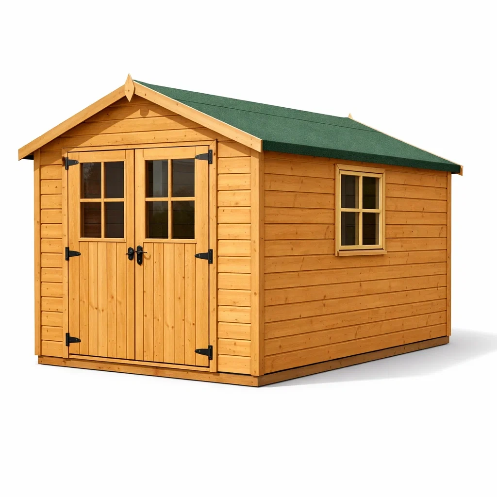 Caractéristiques : Double porte battante, 2 fenêtres en verre, Toit en pente avec couverture en feutre bitumineux vert