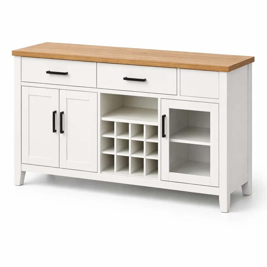 Le buffet dispose de deux tiroirs, trois portes (dont une vitrée) et deux tablettes, ainsi que de 12 casiers pour bouteilles. Il offre un espace de rangement polyvalent.